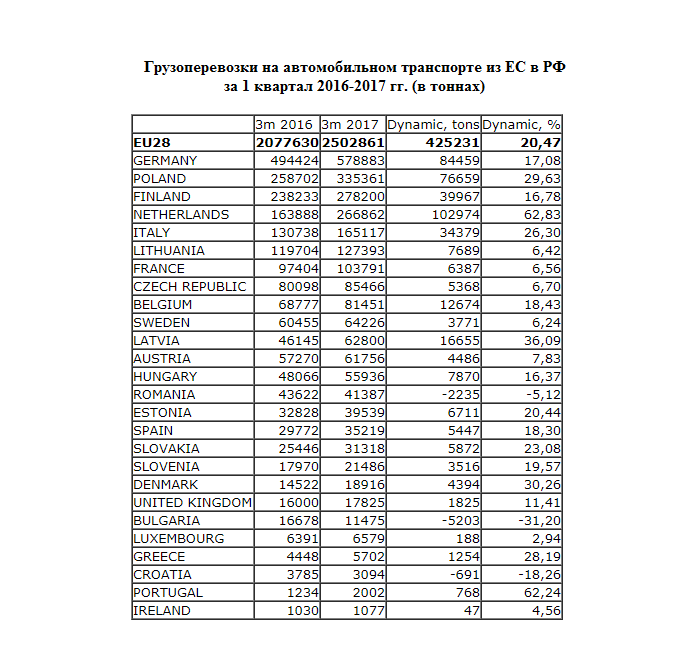 Евростат сообщает, что за первый квартал 2017 года грузоперевозки на автомобильном транспорте из стран Евросоюза в Россию выросли почти на 21%.